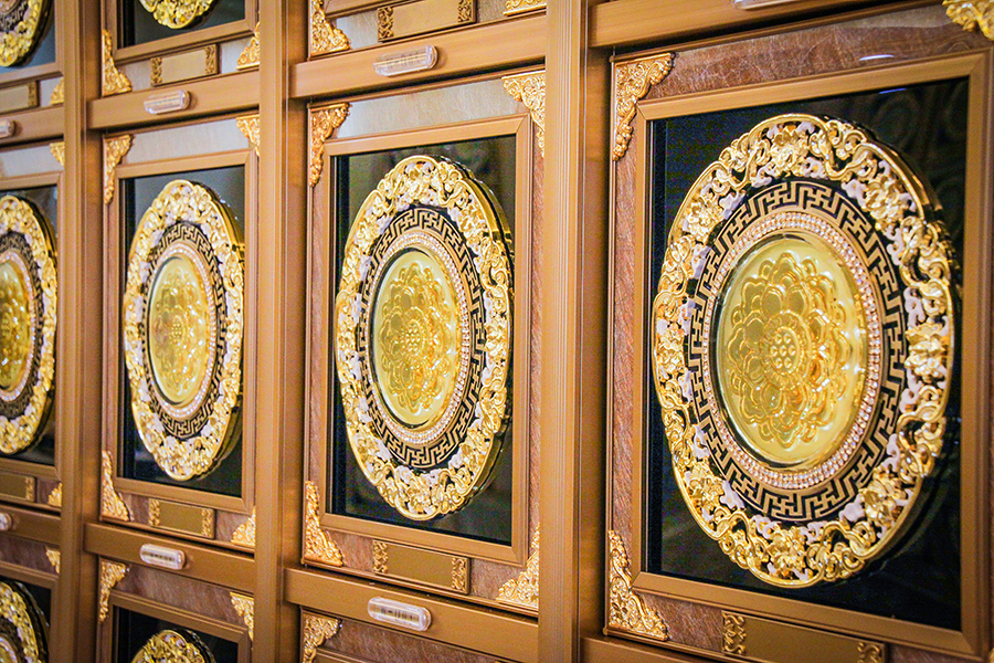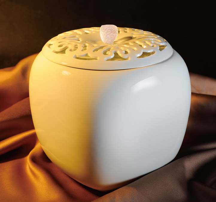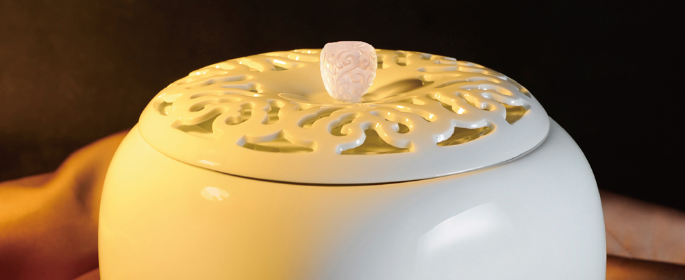 為找尋心目中最好的陶瓷器皿,來到鶯歌古老陶瓷小鎮,拜訪一位手藝精湛的師傅,他用溫暖的雙手仔細雕塑著每一件作品,這一間工作室裡蘊含著無限巧思與細膩。 為製作能承載無限心意與回憶的載體,我們提出燒製全瓷器的高難度要求,師傅選用特殊雪白瓷土,不斷嘗試終於發現適合製器的比例,經由手工注漿、陰乾及素燒等等瑣碎工序,最後一道程序為本燒,以1320度高溫燒造為成敗的關鍵,繁複的手工製作過程中絕不容許絲毫馬虎,必須一氣呵成,否則只能重頭開始,唯有如此講究,才能成就雪白晶瑩的透亮色澤及細緻紋理,最後在上蓋內側繪製真金材質的般若波羅密多心經,更增添高雅與貴氣,經高溫燒製的全瓷器硬度可達8,比玉石更為 堅硬且較不易龜裂,生產過程的困難度更增加其珍貴性。 結合藝術與傳統內涵設計創新載體的造型,以雪白晶瑩的瓷土搭配天圓地方,象徵凡塵中的生命已然超脫世間一切情欲、煩惱,進入純白潔淨的永恆國度,上蓋為細緻鏤空雲狀,彷彿閃耀著金色光芒的五彩雲霞環繞西方極樂世界,引領著摯愛親人在神佛懷中安睡,阿彌陀經中提到極樂國土為瑪瑙、琉璃等嚴飾,因此蓋頂採用白琉璃雕花,宛若轉生於佛陀國土之中,意喻生命的昇華及對來世無限的希望,純手工製器融入手做溫暖,更增添滿滿誠意與感恩,建構出圓滿如意的最終歸宿。 |